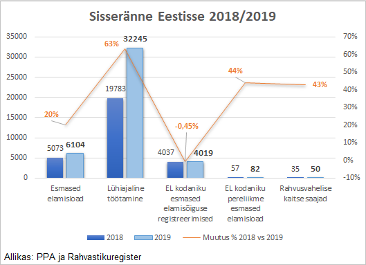 2019. aastal töötati välja ja loodi pinnast mitmetele 2020. aastal jõustunud seaduse muudatustele, mis puudutasid näiteks massilisest sisserändest tingitud hädaolukorda, kaugtöö tegemiseks loodud diginomaadi viisat, aga ka täiendavaid regulatsioone vähendamaks välismaalaste Eestis töötamise (sh renditöö tegemine) rikkumisi. 2019. aastal tehti otsus 2020. aasta sisserände piirarvu jaotuse muutmiseks, vastavalt millele eraldati kindlaksmääratud piirarvu osa loomingulistele töötajatele (28), sportlastele (18) ning neile välismaalastele, kes asuvad Eestisse elama välislepingu alusel (10). Ülejäänud osa piirarvust (1258) jagatakse välja töötamiseks üldalustel. Eelnevatel aastatel ei ole sellist jaotust tehtud. Muudatuse põhjuseks on tagada, et lisaks kõrgelt kvalifitseeritud tööjõule, keda küll piirarvu alla ei arvata, tuleksid Eestisse elamisloa alusel elama ka näiteks kultuuri- ja spordi valdkonnas töötavad välismaalased. Olulist rõhku pandi riiklike strateegiate väljatöötamisele. Siseministeeriumi algatatud Siseturvalisuse arengukava 2020-2030, mille eesmärk on globaalseid suundumusi arvestades turvalise Eesti ühiskonna planeerimine, saadeti 2019. aastal kaaskoostajate kooskõlastusringile; algatati Siseministeeriumi rahvastikuministri ametkonna ja Kultuuriministeeriumi välja töötatav Rahvastiku ja sidusa ühiskonna arengukava 2021-2030; Riigikantselei arendas edasi riigi pikaajalist strateegiat „Eesti 2035”. Lisaks valmis Politsei- ja Piirivalveameti (PPA) strateegia #PPA2030, kus muuhulgas seatakse eesmärgiks välja ehitada 338-kilomeetrine Eesti idapiiri taristu ning katta kogu piirijoon ka ööpäevaringse seiretehnika- ja võimekusega; automatiseerida isikute ja sõidukite piirikontroll; kasutada piirihalduses isiku biomeetrial põhinevaid lahendusi. Samuti on plaanis luua piirihalduse ressursi ning teabe haldamiseks ja sündmuste juhtimiseks ühtne infosüsteem.Eelmisel aastal loodi mitmeid kasutajasõbralikke e-lahendusi: tööandjatel on nüüd võimalus välismaalase lühiajalise töötamise registreerimise taotlus esitada elektrooniliselt (2019. aastal registreeriti 50% töötamisi elektrooniliselt), lihtsustus ja mitmekesistus viisade e-taotlemine; samuti loodi rahvastikutoimingute e-rahvastikuregister. Eesmärgiga jagada laiema avalikkusega sisserände statistika trende, andsid Siseministeerium ja EMN Eesti välja brošüüri „Rändestatistika ülevaade 2014-2018“, mis ilmus eesti ja inglise keeles. Kasvas eriliigiliste integratsioonimeetmete arvNii nagu 2018. aastal, panustati ka 2019. aastal oluliselt erinevate integratsioonimeetmete arendamisse. Avati Tartu välismaalaste teenuskeskus, millega toetatakse, sarnaselt 2018. aasta lõpus avatud Eesti Rahvusvahelisele Majale, välismaalaste paremat integratsiooni Eestis. Teenuskeskusest saab nii nõustamisteenust, kui kontakte riigi ja omavalitsusega suhtlemiseks.Keeleõppes osalemise parandamiseks avas Integratsiooni SA Tallinnas ja Narvas kaks uut eesti keele maja. Paremad keeleõppe võimalusedloovad soodsamad tingimused ka Eesti kodakondsuse taotlemiseks. 2019. aastast alustati keeleõppe lepingute sõlmimist isikutega, kes soovivad saada Eesti kodanikuks. Lepingu sõlmija saab osaleda Sisekaitseakadeemia poolt pakutavatel tasuta eesti keele kursustel, mille raames on õppijal võimalik võtta kuni 20 päeva õppepuhkust, mis hüvitatakse riigi poolt keskmise palga ulatuses. Pärast kursuste lõpetamist peab isik sooritama keele eksami vähemalt B1 tasemel.Kasvanud on ka uussisserändajate endi huvi riiklikult pakutud kohanemise meetmete vastu – nii võttis kohanemisprogrammist osa rekordarv osalejaid (2073 inimest), mis on 30% enam, kui 2018. aastal. Olukord ebaseaduslikus rändesKa ebaseadusliku rännet iseloomustab kasvutendents.Ebaseaduslikult rändelt tabatud välismaalaste koguarv kasvas võrreldes 2018. aastaga 27%, mille peamiseks põhjuseks olid Eestisse tööle saabuvad Ukraina kodanikud. Neist omakorda kasvas riiki sisenemise tingimuste rikkumiste arv 83% (peamiselt oli rikkumiste põhjuseks viisavaba liikumise tingimuste rikkumine) ja viisa väärkasutamised 16%. Sisenemistingimuste rikkujatest ligi 80% olid Ukraina kodanikud, kuid oli ka Gruusia ja Moldova kodanikke. Viisa väärkasutajatest kolmandik olid pärit Venemaa Föderatsioonist, samuti oli nende seas Valgevene ja Ukraina kodanikke. Samas langes migratsioonireeglite rikkumistega seotud väärteomenetluste koguarv ligi 20%, seda eelkõige Eestis ilma seadusliku aluseta viibiva välismaalase töötamise osas, milles oli ligi neljakordne langus. Teisalt on kasvanud välismaalase Eestis töötamise tingimuste rikkumise võimaldamiste arv 29%. Efektiivne ja tõhus migratsioonijärelevalve ning aastatepikkune ennetus- ja teavitustöö on oluliselt aidanud kaasa ebaseadusliku töötamise vähenemisele.2019. aastal kasvas võrreldes eelmise aastaga lahkumisettekirjutuste arv 35%, mille suurenemist mõjutas nii ebaseaduslikult riigis viibivate kui ka ebaseaduslikult rändelt tabatud isikute arvu suurenemine. Lahkumisettekirjutusi tehti kõige enam Ukraina (43% kõikidest ettekirjutustest), Vene Föderatsiooni ja Moldova kodanikele. Valdav osa (83%) kõikidest ettekirjutustest olid vabatahtliku lahkumise tähtajaga. 2019. aastal oli lahkumisettekirjutuste täitmise osakaal 89%, mis on Euroopa Liidu üks kõrgemaid.Parandamaks valmisolekut võimalikeks rändekriisideks korraldas PPA suurõppuse HotSpot 2019, mille raames harjutati massilise sisserände olukorras esmaste menetlustoimingute nagu isikute identifitseerimine, esmane tervisekontroll, daktüloskopeerimine jm, läbiviimist. Õppusest võttis osa ligi 400 PPA ametnikku, lisaks osales mitmeid partnerorganisatsioone nii Eestist kui välisriikidest.2019. aastal jõustus seadusemuudatus, mis võimaldab välismaalasest kinnipeetava/süüdistatavaga sõlmida kokkulepe isiku vabatahtlikuks riigist lahkumiseks, milles PPA annab prokuratuuri või vangla tao