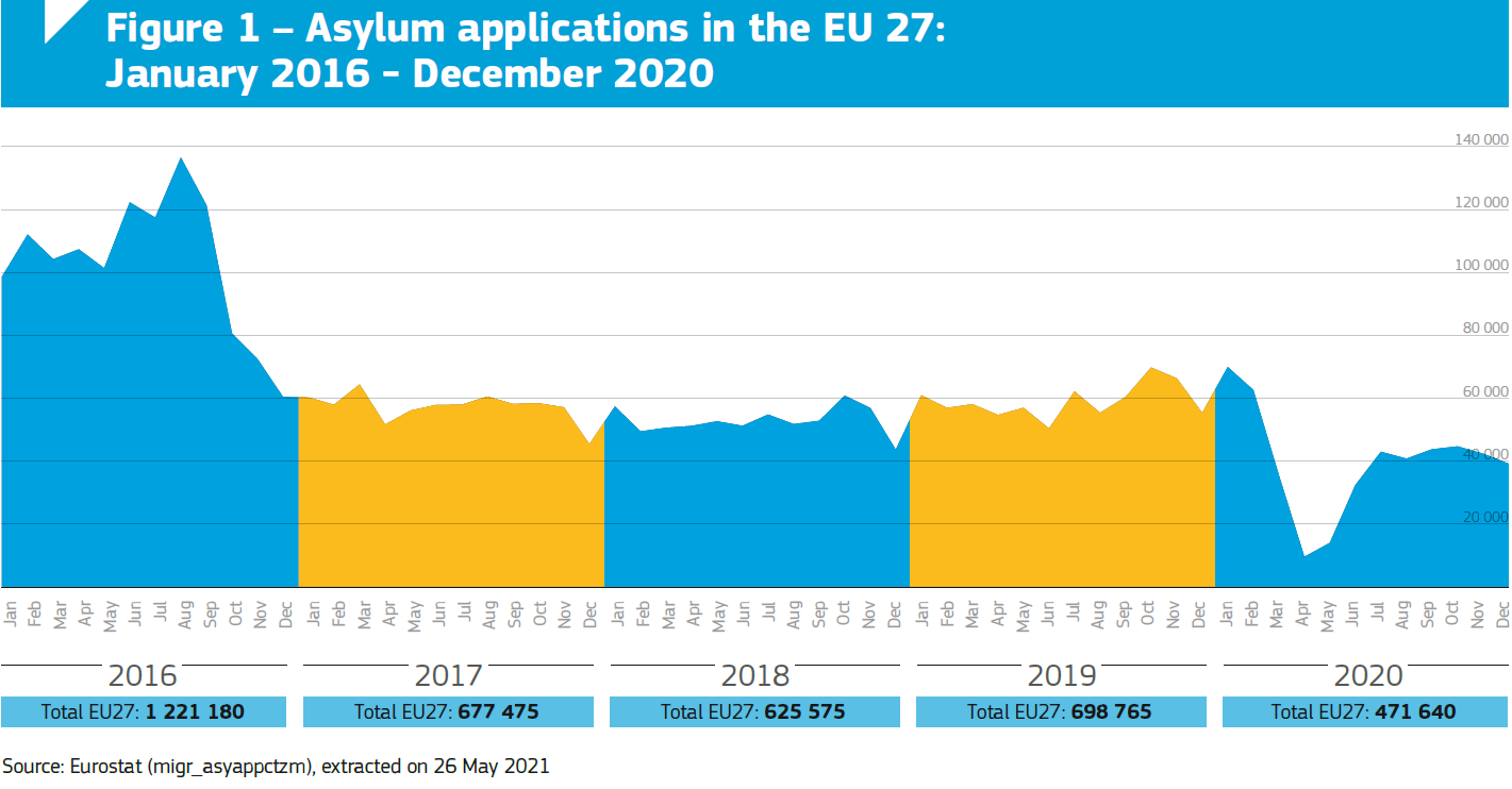 Rahvusvahelise kaitse valdkord oli samuti olulisel määral mõjutatud COVID-19 pandeemiast. 2020. aastal esitati Euroopa Liidus kokku 471 000 rahvusvahelise kaitse taotlust, mis on 33% vähem kui 2019. aastal (vt joonis).