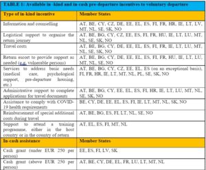 Kõik LRd (v.a Itaalia) pakuvad inimesele enne riigist lahkumist mingisuguseid motivatsioonimeetmeid. Mitmed neist on sõltuvad geograafilisest regioonist, kuhu isik tagasi pöördub, või on isikupõhised ja tema vajadustele kohandatud. Mitmes LR tehakse enne iga meetme pakkumist juhtumipõhine hindamine, kas ametiasutuse või teenusepakkuja (näiteks Rahvusvahelise Migratsiooniorganisatsiooni ) poolt.