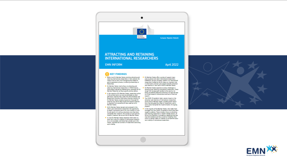 How do Member States attract and retain international researchers? The latest inform from the European Migration Network (EMN) provides an overview of the means adopted by Member States to enhance attractiveness for international researchers, as well as main challenges and best practices to admit and retain them.   Third-country researchers from non-EU countries can provide important expertise to European universities and other research institutions, promoting knowledge circulation across the EU. The Students and Researchers Directive[1] seeks to improve and harmonise legal standards for welcoming and retaining international students and researchers, as well as making the EU a more attractive destination for them. This inform draws on the contributions of 22 Member States (AT, BE, BG, CY, CZ, DE, EE, EL, FI, FR, HU, HR, IE, LV, LT, LU, MT, NL, PL, SK, SI, SE.) and aims to explores challenges and good practices adopted at EU and national level. While most EU Member States prioritise attracting and retaining international researchers in their policies, the means to do so vary. Member States adopt promotional and informational activities to enhance their attractiveness for international researchers, including leaflets, info days, websites, media campaigns, or missions abroad. The inform also reports bilateral and multilateral cooperation agreements between EU Member States and third countries, aiming to provide funding for joint research projects or the creation of networks of academics. Member States additionally facilitate the application process for international researchers, for instance offering the possibility of fast-track applications, an extension of the maximum period of long-term mobility, as well as financial facilitation and support. In relation to the admission of international researchers, the inform highlights that several Member States refer to the Students and Researchers Directive, with some also implementing other national or EU employment-focused schemes that admit international researchers as highly qualified workers. In situations not covered by EU law, additional specific research-focussed national schemes are applied. At national level, several measures are in place to facilitate the retention of international researchers. These include providing support to obtain a residence permit and registering residence with local authorities; support on arrival; induction and orientation. The inform highlights that EU Member States give international researchers the opportunity to obtain a temporary permit for nine months or more for job search or to set up a business once they have completed their research. Member States face various challenges in attracting and retaining international researchers. These range from bureaucratic hurdles to the country not being considered sufficiently attractive, for example due to limited research infrastructure and lack of financial support. The COVID-19 pandemic had a severe impact across the EU. For instance, travel restrictions have disrupted the inflow of researchers, and in some cases prevented the implementation of ongoing projects. In order to address these issues, new measures were introduced, such as more online or hybrid modes of mobility to complement the limited physical mobility of international researchers. Read the new inform HERE. References: [1] Directive (EU) 2016/801 of the European Parliament and of the Council of 11 May 2016 on the conditions of entry and residence of third-country nationals for the purpose of research, studies, training, voluntary service, pupil exchange schemes or educational projects and au pairing (recast): https://eur-lex.europa.eu/eli/dir/2016/801/oj, last accessed on 5 April 2022.
