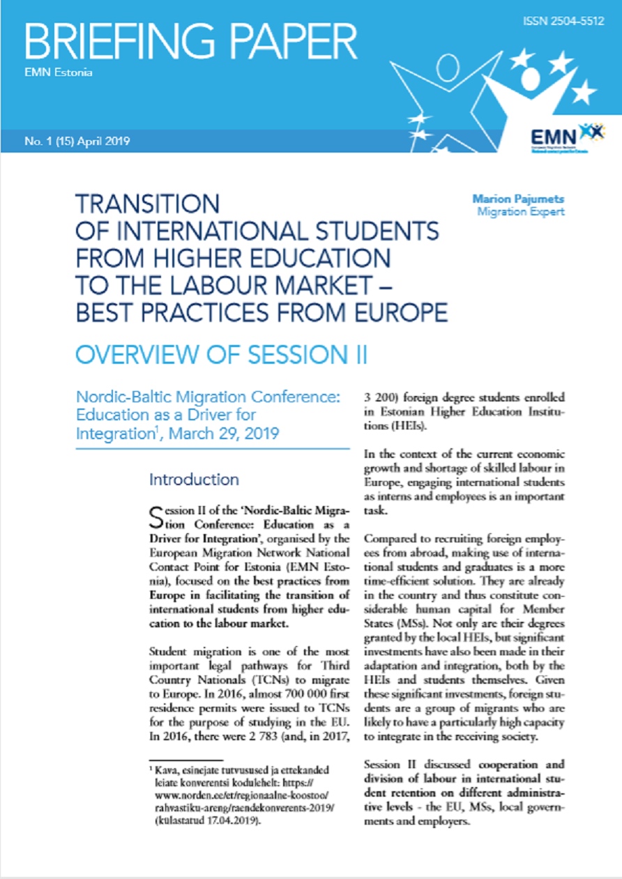 Briefing paper (15 ) 2019: Transition of International Students from Higher Education to the Labour market – Best practises from Europe