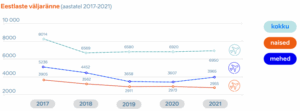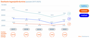 Perioodi 2017-2021 kokkuvõttes oli eestlastest väljarändajate koguarv (35 033) väiksem kui tagasipöördujate koguarv (36 606). Viimase viie aasta arvestuses on Eestisse saabunud 1573 Eesti kodakondsusega inimest rohkem kui siit lahkunud. Rändajad on seni olnud pigem mehed kui naised.