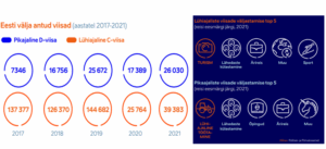 Sarnaselt eelmise aastaga, väljastasid nii Eesti välisesindused kui ka Politsei- ja Piirivalveamet (edaspidi PPA) vähemas mahus lühiajalisi C-viisasid (võrreldes 2020. aastaga kasvas küll 53%, aga võrreldes Covid-19 eelse ajaga oli endiselt suur langus). 2019. a tasemele taastus pikaajaliste D-viisade arv (kasv võrreldes 2020. a 50%). 2021. a oli C-viisade väljastamise peamine eesmärk turism, D-viisadel oli selleks lühiajaline töötamine.