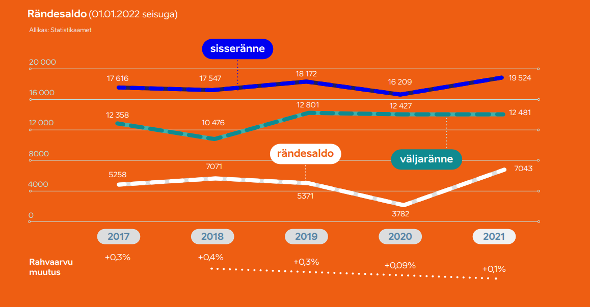 Üha enam inimesi asub Eestisse elama, töötama või õppima, kelle seas on palju ka Eesti kodanikke. Statistikaameti andmetel oli Eesti rahvaarv 1. jaanuari 2022 seisuga 1 331 796. 2021. aastal vähenes loomuliku iibe tõttu (mil kõrge suremus ületas viimastel aastatel samale tasemel jäänud sündimuse) rahvaarv 5315 inimese võrra ning positiivse rändesaldo tõttu (Eestisse saabus elama rohkem inimesi kui siit lahkus) suurenes 7043 inimese võrra. Kokkuvõttes kasvas Eesti rahvaarv 1728 inimese võrra. 2021. aastal saabus Eestisse elama 19 524 inimest ja siit lahkus välismaale 12 481 inimest. Sisseränne suurenes võrreldes 2020. aastaga 3315 ja väljaränne vaid 54 inimese võrra.