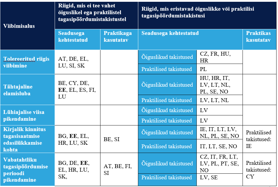 Liikmesriikides seatakse isiku ebaseadusliku riigis viibimise lõpetamises esikohale (vabatahtlikku) tagasipöördumist, samas kui isiku seadustamist käsitletakse riiklikes poliitikates vaid marginaalselt. Riikide headest praktikatest saab esile tõsta isikute julgustamist tagasipöördumiseks läbi tagasipöördumise nõustamise teenuse. Samuti rakendavad riigid praktikat, et vähendades teatud aja jooksul teenuste kättesaadavust, on isikud vähem motiveeritud jääma ebaseaduslikult riigis viibijaks.