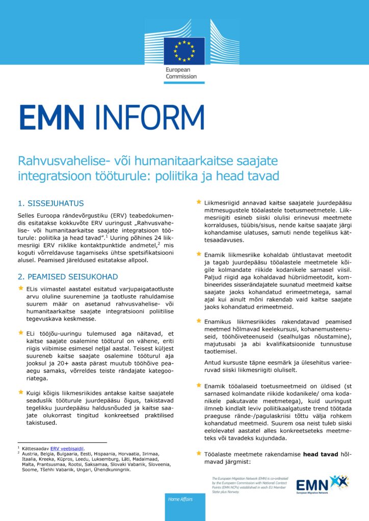 Rahvusvahelise- või humanitaarkaitse saajate integratsioon tööturule: poliitika ja head tavad