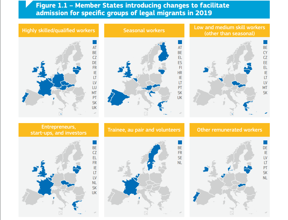 Enne kui COVID-19 pandeemia tõusis päevakorras kõige olulisemaks teemaks, toimusid 2019. aastal Euroopas mitmed suured muutused: Euroopa Parlamendi valimised, Euroopa Liidu uue juhtkonna kinnitamine ning Ühendkuningriikide lahkumine liidust, mis sai teoks 2020. aasta alguses. Need muutused mõjutasid oluliselt ka Euroopa rände- ning varjupaigavaldkonda. Keskseks teemaks oli jätkuvalt sisseränne, ka Euroopa Liidu uus juhtkond seadis üheks oma prioriteediks „värske alguse“ rände- ja varjupaigavaldkonnas, mida peaks tutvustama peagi avaldatav rände- ja varjupaigapakt. Peamised arengud rände ja varjupaigavaldkonnas Seaduslik ränne 2019. aastal valmis  ELi seadusliku rände regulatsioonide sobivusanalüüs (fitness check), mille raames analüüsiti EL tasandi õigusakte ning nende eesmärgipärasust, hõlmavust ning võimalikke puudujääke. Selgus, et kuigi seaduslikku rännet puudutav EL tasandi poliitika täidab suuresti oma eesmärki, on teatud ränderühmad, keda praegused õigusaktid ei hõlma. Näiteks pole direktiivide või määrustega kaetud madala ja keskmise oskustaseme kvalifikatsiooniga töötajad. Eelneval aastal võeti seadusliku rände valdkonnas kasutusele mitmeid uuenduslikke meetmeid just tööturu vajaduste rahuldamiseks. Sealhulgas uued meetodid talentide meelitamiseks, mis olid peamiselt suunatud kõrgelt kvalifitseeritud tööjõule, kuid osalt ka keskmise ning madala kvalifikatsiooniga tööjõule. Näiteks tagas Iirimaa vaba ligipääsu tööturule nende töötajate abikaasadele ja de facto partneritele, kes omavad tööluba, mis antakse äärmiselt vajalike oskustega töötajatele. See tähendab, et Iirimaal töötamiseks ei pea nende kaaslastel olema tööluba. Tšehhis aga hakati uue programmi raames toetama tööandjaid kolmandatest riikidest pärit talentide palkamisel. Efektiivsemaks tööjõu meelitamiseks lihtsustati mitmes riigis samuti administratiivseid ning õiguslike nõudmisi ja arendati statistilisi meetodeid hindamaks riikide tööjõuvajadust. Lisaks kvalifitseeritud tööjõu meelitamisele keskenduti jätkuvalt välistudengite meelitamisele. Muuhulgas lihtsustati õpilasviisade taotlemisel dokumendi- ning teisi taotlemise nõudeid, loodi õpilasviisade kiirmenetluse võimalusi ning soodustati tudengite ligipääsu tööturule nii õpingute ajal kui ka pärast õpingute lõppu.            Oluliseks kujunes ka perekonna taasühinemise soodustamine. Mitmed liimesriigid laiendasid õigusi perekonna taasühinemiseks uutele kolmanda riigi kodanike gruppidele (nt Leedus laiendati seda õigust oma kodaniku samasoolisele partnerile), muutsid rahalisi ning ajalisi nõudeid, mis perekonna taasühinemiseks tuleb täita ning edendasid pereliikmete ligipääsu nende õigustele (nt ligipääsul tööturule). Rahvusvaheline kaitse 2019. aastal teatas toona peatselt ametisse astuv Euroopa Komisjoni president uue rände- ja varjupaigapakti koostamisest eesmärgiga liikuda edasi läbirääkimistega Euroopa ühise varjupaigasüsteemi osas ning taaskäivitada Komisjoni poolt 2016. aastal välja pakutud varjupaigareform. Loodetakse, et uus pakt aitab luua liikmesriikide vahel ka uut sorti solidaarsust ning kindlustab, et need riigid, mis on suurima rändesurve all, saavad piisavalt toetust teistelt liikmesriikidelt. Varjupaigareformi taaskäivitamine on eriti asjakohane lähtudes asjaolust, et eelmisel aastal kasvas varjupaigataotluste arv esimest korda pärast 2015. aasta rändekriisi. 11,4% suuruse tõusu taotluste arvus 2018. aastaga võrreldes tõi kaasa pingete kasv maailma eri paigus, nt Venezuelas ja Süürias.  2019. aastal jätkati ümberasustamise programmidega ning kokku asustati ümber peaaegu 30 000 inimest. Samas suurusjärgus ümberasustamisi on liikmesriigid ja Norra lubanud ka 2020. aastaks. Liikmesriigid tegid jõupingutusi ka varjupaigamenetluse tõhustamiseks ning kvaliteedi tõstmiseks. Arendati uusi kvaliteedikontrollitööriistu ja liiguti enam digitaliseerituma varjupaigamenetluse suunas. Hollandis aga loodi varjupaigataotlejatele n-ö menetlussihtkohad, kus ühel alal on koos kõik organisatsioonid, mis on varjupaigamenetlusega seotud ning kus varjupaigataotlejaid majutatakse kogu menetluse vältel. Haavatavad grupid rändes Rände- ja varjupaigavaldkonnas oli jätkuvalt fookuses haavatavate gruppide kaitse ning toetus. Muuhulgas võeti vastu Malta deklaratsioon, millega loodetakse leevendada paadipõgenike olukorda Vahemerel, võideldi sotsiaalse dumpingu ning tööjõu ärakasutamise vastu (nt läbi teadlikkuse tõstmise kampaaniate ning tööinspektorite intensiivsema kasutuse) ja võeti kasutusele meetmeid, et paremini tuvastada ning kaitsta LGBTQI rühma kuuluvaid isikuid (nt läbi ametnike koolitamise soo ja seksuaalse orientatsiooni teemadel).